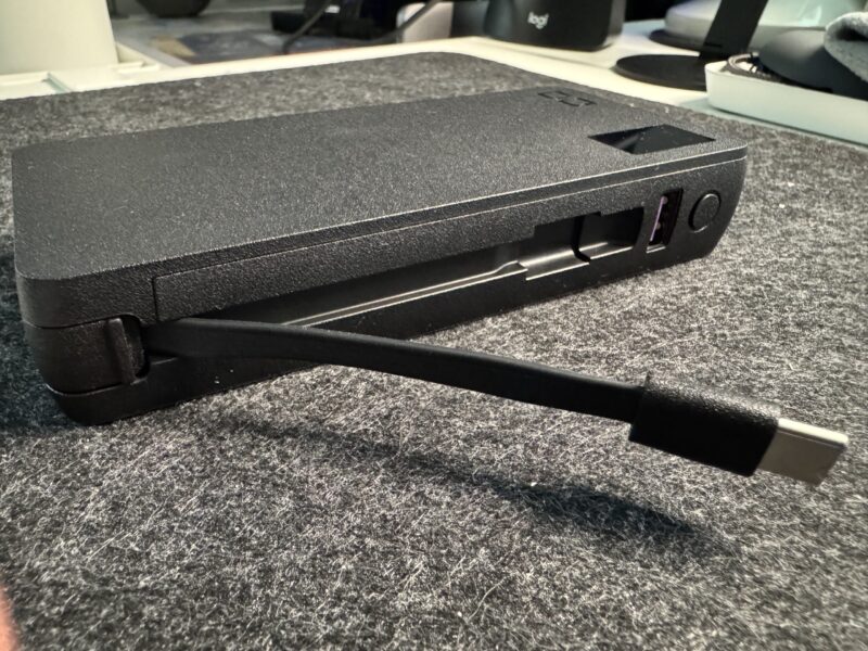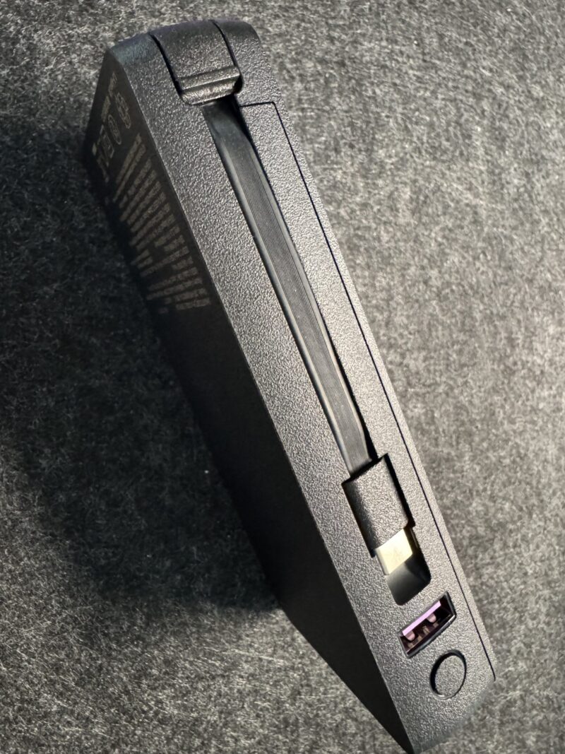 横はこんな感じ。ケーブルが内蔵されており、取り外すこともできます。またUSB Type-Aとボタンがついています。