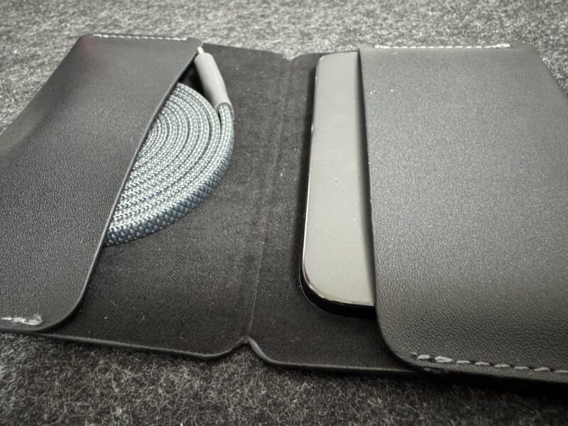 開くと両側に収納スペースがあり、モバイルバッテリーとケーブルを収納することができました。閉じるときにはマグネットが内蔵されているので、中身が飛び出る心配もなさそうです。